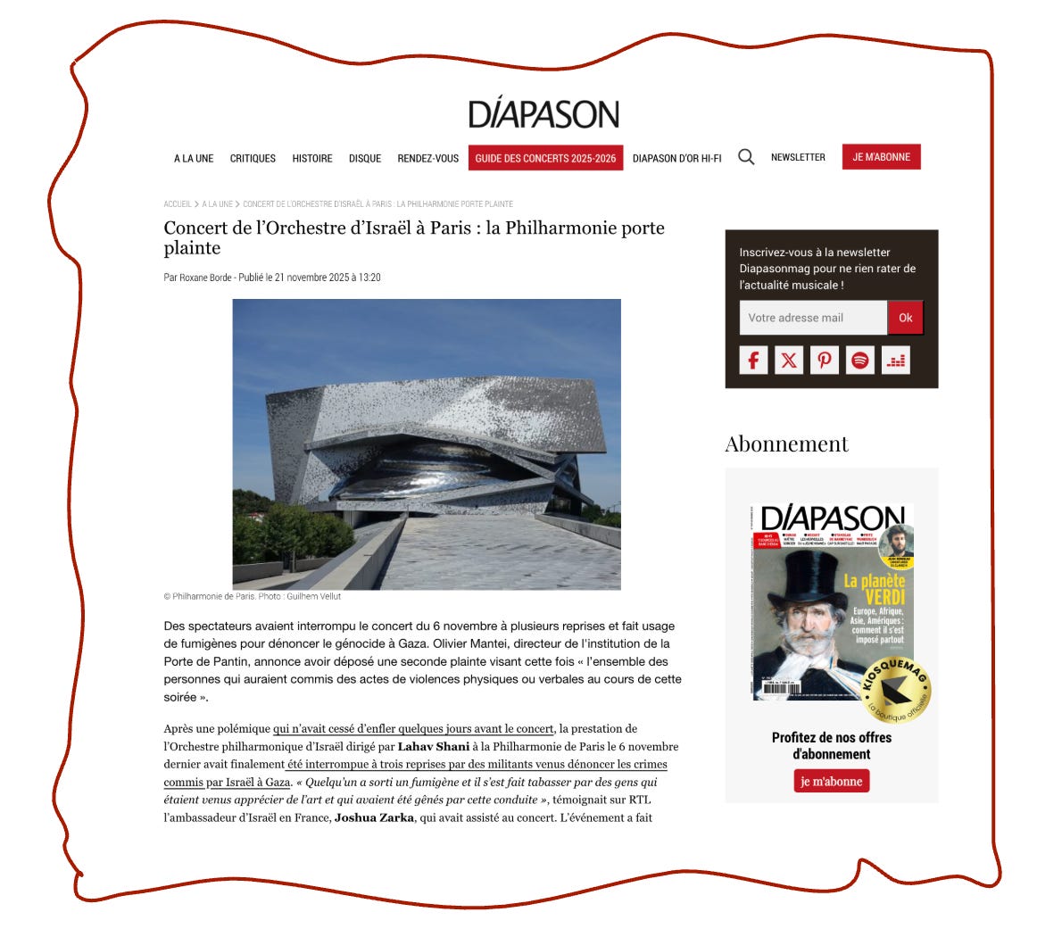 Ensuite, il y a eu une tribune le 16 septembre 2025 — cet « Appel au boycott culturel contre le génocide du peuple palestinien » — sur le site de Mediapart, toujours dans l’espace « Club ». Parmi d’autres signataires très, très peu classiques, on retrouvait le même binôme. Cette tribune visait le concert de Lahav Shani prévu le même jour à la tête du Philharmonique de Munich au Théâtre des Champs-Élysées.