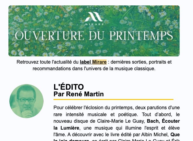 J’ai reçu il y a quelques jours la nouvelle lettre d’information du label Mirare, fondé par René Martin :