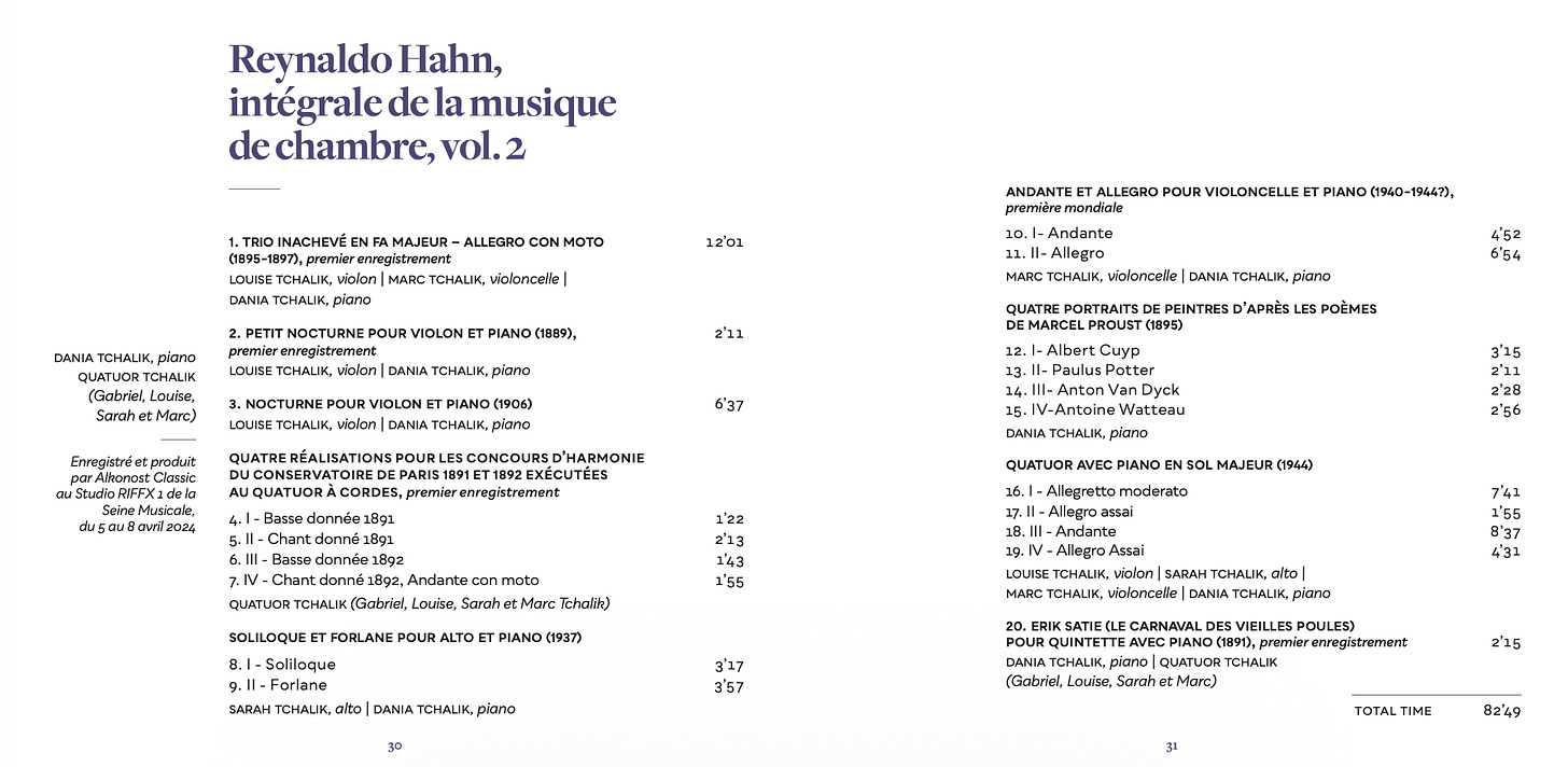 La remarquable fratrie Tchalik a fait paraître, il y a huit jours, le deuxième et très copieux volume de son intégrale de la musique de chambre de Reynaldo Hahn. Celui-ci se distingue par plusieurs premiers enregistrements mondiaux et des œuvres restituées par le musicologue Philippe Blay. J’en reproduis ici le tracklisting :